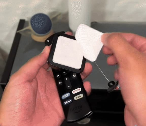 Bevestig het uiteinde van de kabel aan het gewenste voorwerp zoals een afstandsbediening. De plakstrip aan het uiteinde van de kabel is licht vervormbaar en valt dus te gebruiken met verschillende vormen van voorwerpen.